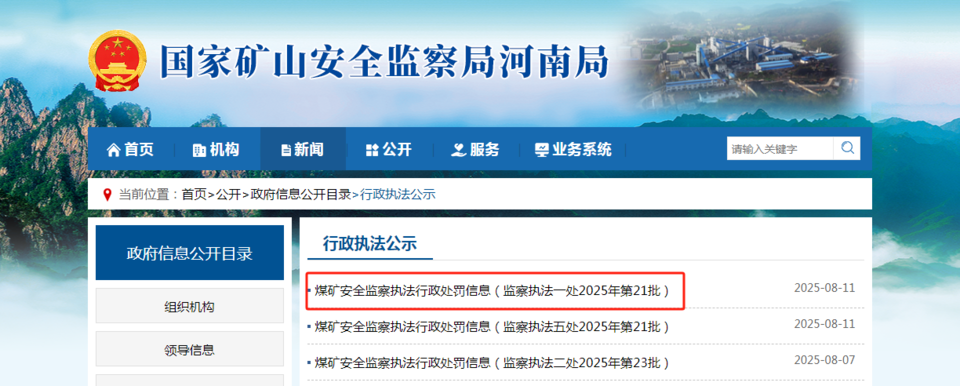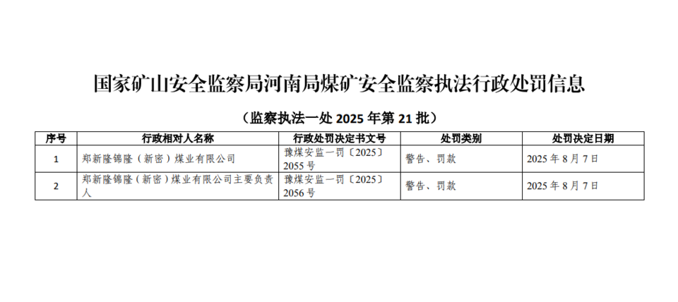 皆鲁晚报·皆鲁壹点记者于国度矿山安全监察局河南局行政司法公示栏获悉,8月11日,其公示了煤矿安全监察司法行政责罚信息(监察司法一处2025年第21批),郑新隆锦隆(新密)煤业有限公司偏激主要追究东说念主上榜。