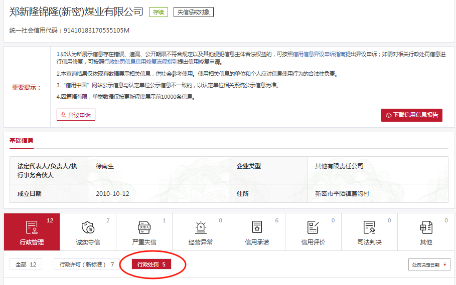 皆鲁晚报·皆鲁壹点记者于信用中国查询到,郑新隆锦隆(新密)煤业有限公司有多条行政责罚纪录。死心发稿,该公司可查询到的行政责罚纪录有5条。