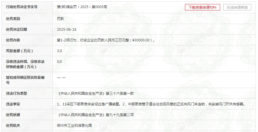 举例,在2025年6月18日,该矿因11采区下部泵房未安设救急播送安装;中部泵房管子说念去往总回风巷的正反向风门未连锁,未安装风门开关传感器,被郑州市工业和信息化局罚金3万元,行政责罚决定书文号豫(郑)煤安罚﹝2025﹞第0005号。