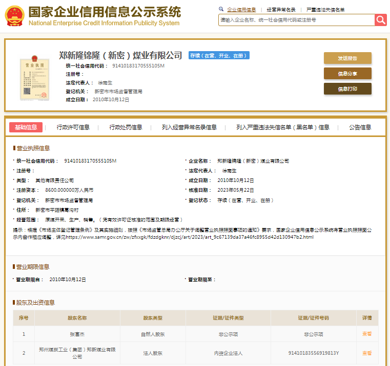 国度企业信用信息公示系统透露,郑新隆锦隆(新密)煤业有限公司诞生于2010年,注册本钱8600万元东说念主民币,法定代表东说念主为徐南生,大激动是郑煤集团全资子公司——郑州煤炭工业(集团)郑新煤业有限公司。